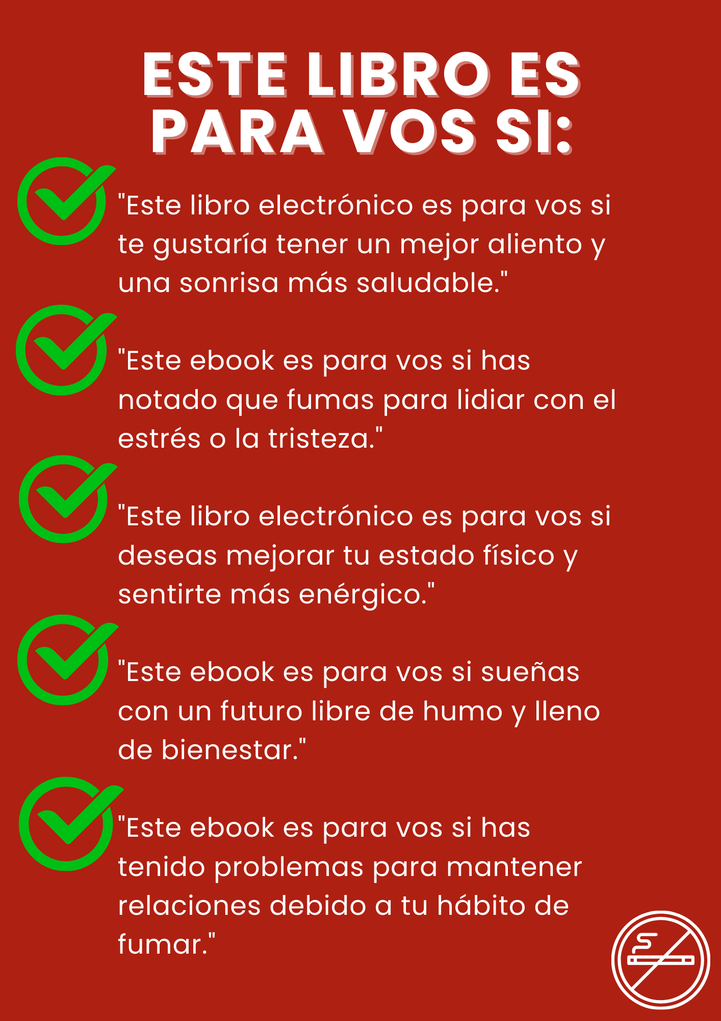 Tu éxito es nuestro compromiso. Queremos que te sientas totalmente confiado al invertir en tu futuro libre de humo. Recuerda, esta garantía es para que te animes a dar el paso que has estado postergando; Si no es lo que esperabas, te devolvemos tu dinero. ¡No dejes pasar esta oportunidad de cambiar tu vida! Prueba nuestro eBook hoy y comienza tu viaje hacia una vida más saludable y plena.